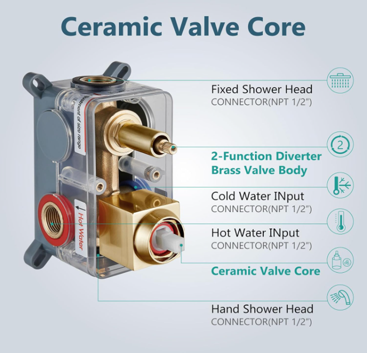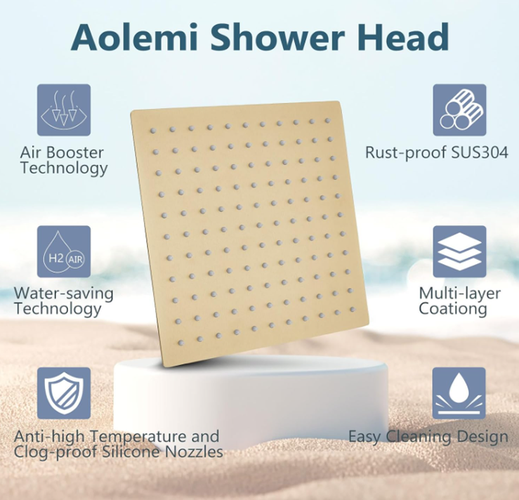 - Material:Aolemi shower fixtures with solid brass rough-in valve and heavy duty.The other parts are also metal making it durable.SUS304 rain shower head with silicone nozzles allows you to wipe away mineral deposits with the swipe of a finger
