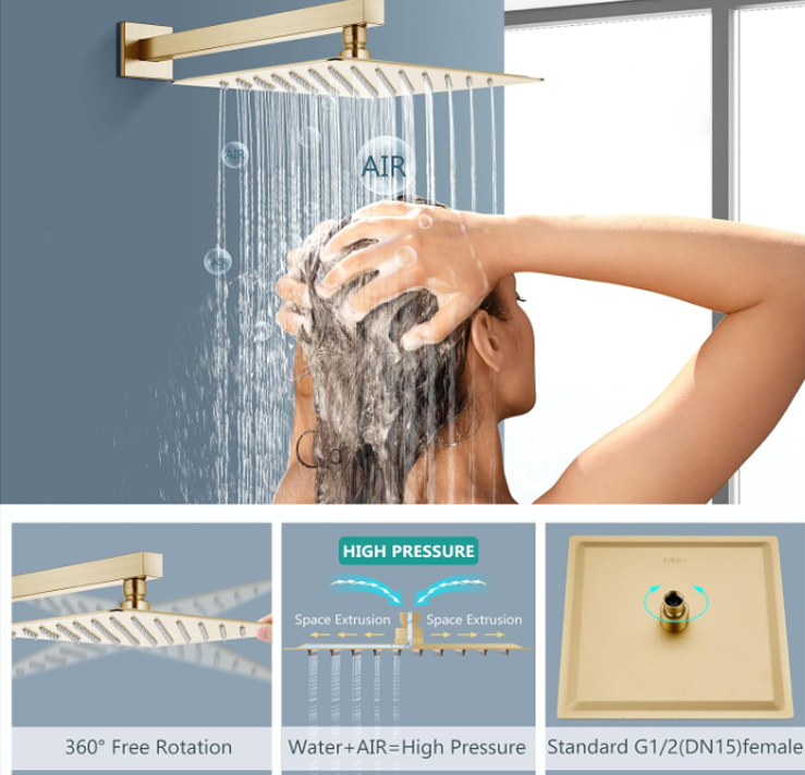 - High Pressure Square Rainfall Shower Head: Water Use Information:1.46 Gpm 5.52L/Min.12 inch rain shower head mixes water with air to increase the water pressure even under low water pressure, offer powerful high water pressure